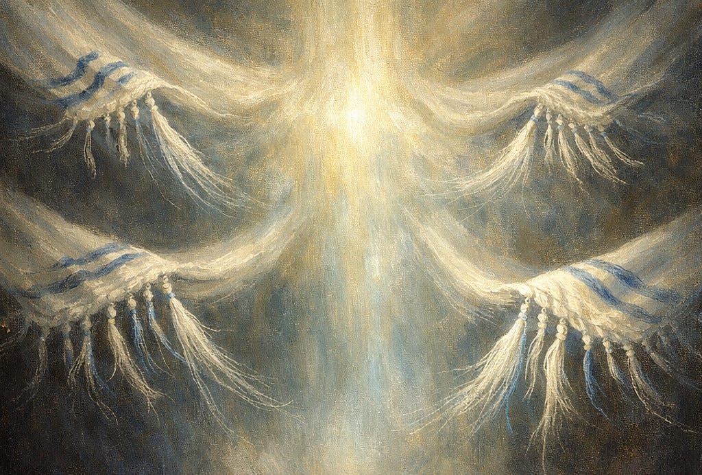 Ce verset provient de la vision inaugurale du prophète Ézéchiel, où il entrevoit le Merkava — le Char céleste — entouré de figures mystérieuses, de roues enflammées et d’un rayonnement lumineux tout autour. Cette lumière circulaire symbolise la Présence divine qui entoure toute chose, même lorsqu’elle demeure cachée aux yeux de l’homme. Elle fait écho ici à la fonction des tsitsit, qui enveloppent l’homme d’une conscience de sainteté sur les quatre côtés de son vêtement, dans toutes les directions du monde.